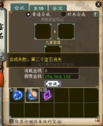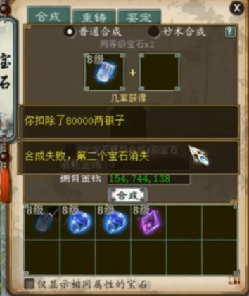 在宝石界有个小传闻,就是“双数难成单数成”,如果准备的宝石是单数,那么成功几率就会大大增加,今天这位玩家准备了五颗可交易的大话西游2宝石,打算合个九级宝石,咱们来看看传闻是否靠谱! |