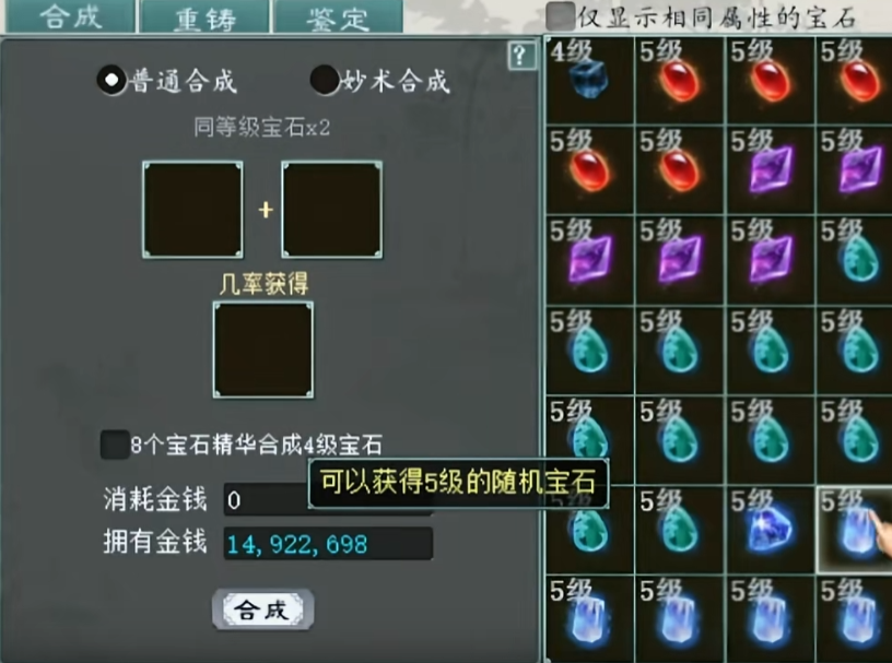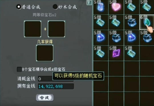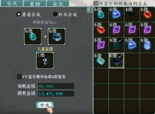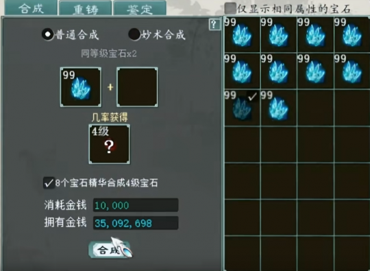 合宝石是件风险极大的事,当然收益也是非常惊人,今天这位玩家买了十组大话西游2宝石精华,准备好好搏一把,能合出一颗八级宝石那就赚了! |
