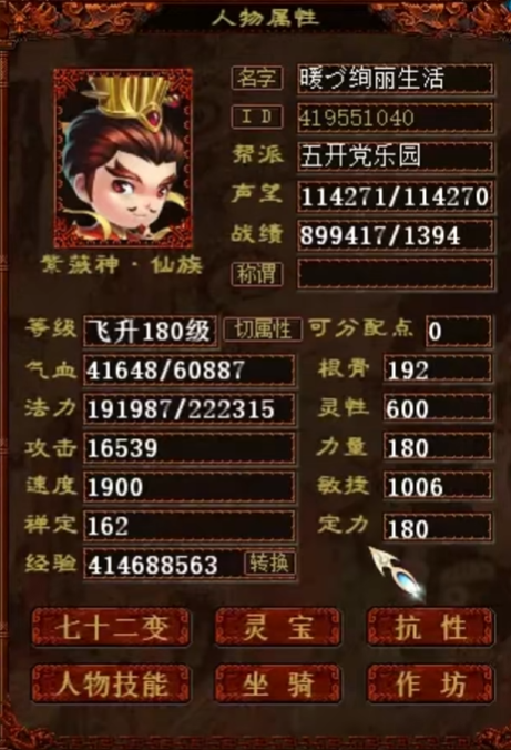 大话西游2飞升180级的号,在全身没有神兵仙器的情况下,竟能做到强法近200,忽视破65.的数据,看来这位仙族玩家确实是下了一番苦工,下面就一起来欣赏吧! |