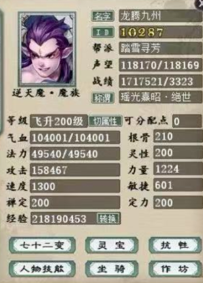 某玩家前来展示自己打造的六破大力魔,1300的速度,18.5万的攻,这江湖上的高手真是数不胜数,说不定你的队伍里就出现这么一位猛人! |