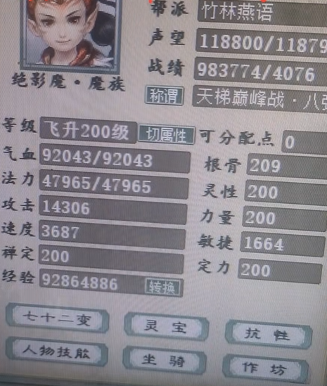 向打进巅峰战八强,需要投资多少才能做到?今天给大家展示一个大话西游2男魔号,他正是巅峰八强敏队主力,站街变范式卡速度可达3687,就免就来欣赏他的装备硬件及宝宝吧! |