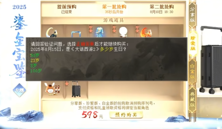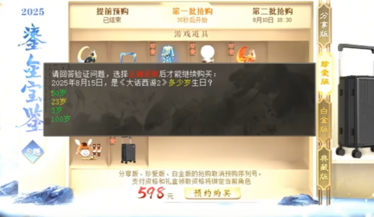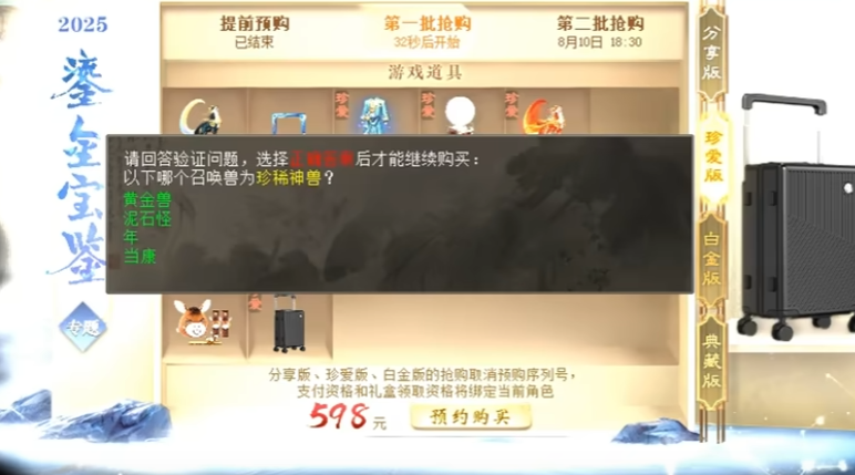 今年的大话西游2鎏金宝鉴抢购已经结束了,不知兄弟们都抢购成功了吗?话说,这次也算是打破以往的抢购规则了,大家觉得过程是不是比较容易呢?下面就来回顾下本次抢购现场,最后也有一个“奇怪”的问题想问问大家! 怀旧江湖,重回经典!大话2怀旧服火热回归中,想要冲怀旧新服的兄弟,别忘领取叶子猪专属礼包码,在游戏中激活即可获得超多道具奖励! 怀旧服至尊礼包码: DHXSMTYZZ 老友专属新服礼包(仅限2003新服): DHQYYZZ |