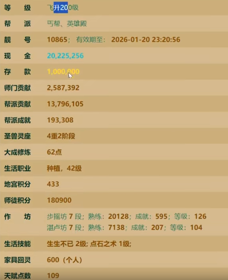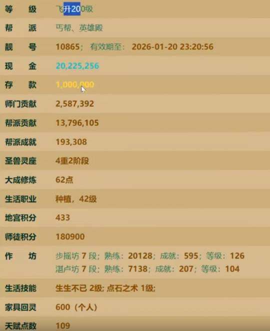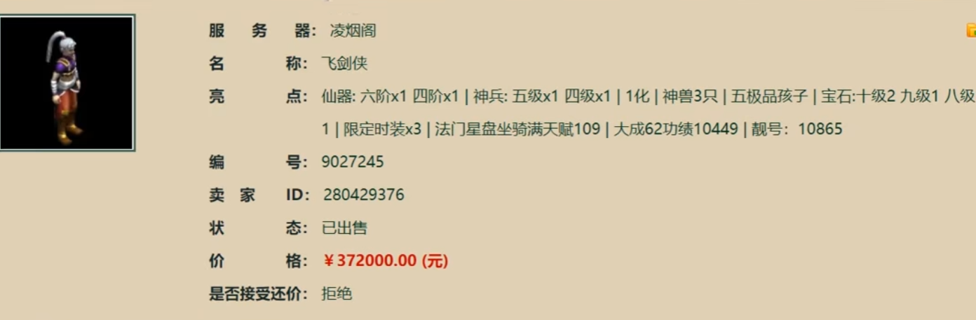 兄弟们在买号时,会关注职业和作坊这些细节吗#89今天这个大话西游2男人号,职业作坊都挺“垃圾”的,但最终却以37.2万的价格成交,看来最近的账号交易市场的确相当火爆啊,下面就来欣赏下这个号的各方面情况吧! |