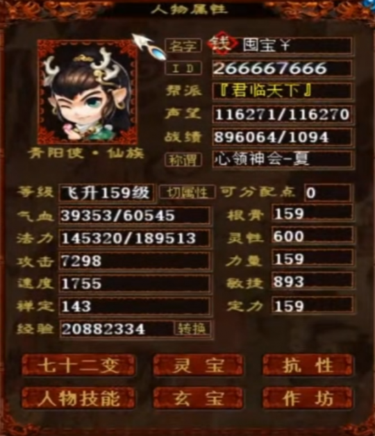 159级大话西游2百爆克火炮前来展示,作为一个任务小号来说,各方面已经相当超标了,咱们先来看属性和装备搭配,最后再奉上伤害数据! |