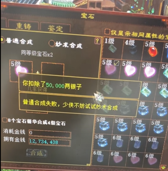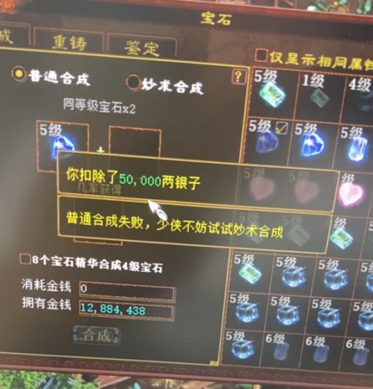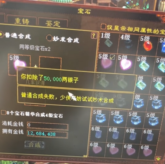 兄弟拿出攒了近两年的大话西游2宝石,准备合上一波,没想到几率居然如此不顺,似乎这才是大家平时的日常感受吧? 平时看多了上九上十的内容,这是因为成功了才能被兄弟们看到,而无数次的失败却埋藏在江河湖海里......不知大家平时合宝石时,是不是也感觉如此艰难呢? [编辑:mzjue]