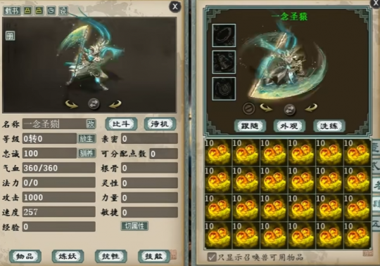玩家从零级开始,准备给一只大话西游2一念圣猿吃神兽丹,咱们看看开格子到底顺不顺利!