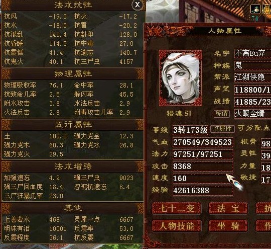 所谓半成品,抗没抗满,反震低,狂暴也低,没有达到最初的目的。 >>推荐阅读:2013年:我梦想中的魔族是这样的 随便发个夫妻号,都是些普通BB,自己带的基本上是三开带双高或三高技能,就是亲密高点,魔号孩子4780+,金刚40+,坐骑12456满级,156满熟练,鬼号孩子垃圾些孝心高些金刚也有41,坐骑1356满级,16满熟练,两号带多种套装,普通移山有用的套装基本都齐了,卓越套装魔用三件兰心配重楼,鬼号有三件雅声。魔号套装有:重楼,半夏,寒鸦,昂日,太皓,腾蛇,燃灯,六芒,红泪,残梦,寒隐,狂阳,须弥,录台。鬼号有:吡卢,昂日,六芒,腾蛇,燃灯,碧落,寒鸦,残梦,雅声(三件),释厄,秋桑,须弥,六合。两个号均搭配有刷天装(多克刷天专用装,多克对修罗也有用),大雁塔装,任务装(强回血程度装用于一般任务及魔王窟)。 <<<点击进入大话西游2论坛讨论>>>
