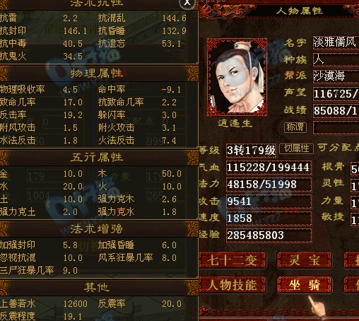 此单挑男的属性灵活多变,从高敏1858的属性到62万血的属性可以及时切换,同时抗性也不会有很大打折! >>推荐阅读:“缘定三生杯”叶子猪第二届单挑赛开启报名 对于装备搭配和召唤兽的搭配,他的选择也是非常独到的,舍生,信土,法宠的运用无所不用其极! <<<点击进入大话西游2论坛讨论>>>