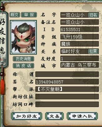 来自水晶宫【不灭皇朝】的敏队一览纵山小带领的敏队一直是一个很喜欢的另类暴力敏队,虽然大话在中途出现很多对于敏队来说致命的修改,对敏队打击很大,但是此队一直在坚持,就好像是一种与生俱来的信仰,用他们自己的话说就是:一直只专注于敏队。 队伍的组合是一遗忘鬼,一负敏鬼,一男魔,双火力炮,虽然很另类,但是真的很暴力,十分喜欢。 >>推荐阅读:极品克装大收集:适合平民玩家的克木装备 <<<点击进入大话西游2论坛参与讨论>>>