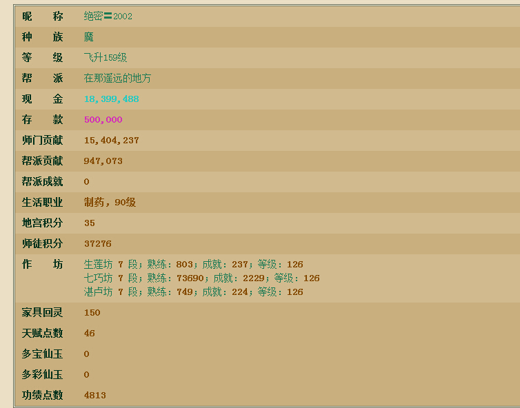 看到一个不错的性价比飞升160女魔号,有需求的朋友可以联系。 >>推荐阅读:大话西游2经典回顾篇:十天十队之红颜知己HAPPY家族队 4年以上区一生所爱出售飞升159女魔号,攒了20Y经验,功绩目前4813,很多简单的都没刷(暗雷,阿三等等,不花钱差不多能刷到5300),天赋46天,现在是男魔修正,第二套修正刚烧了2转,装备带一套敏魔装备,(全敏配饰一套,都是满默契6级和7级默契4000+的)T6,T7,日常升级装备等,召唤兽带一只高分黄金,一只血念,孩子1个满孝心神结局4961和 2个4800+孩子,套装方面,新出的覆海基本没刷,其他套装大部分都有,个别差个1--2个部件,就是没收录,坐骑6个满级满熟练。 <<<点击进入大话西游2论坛讨论>>>