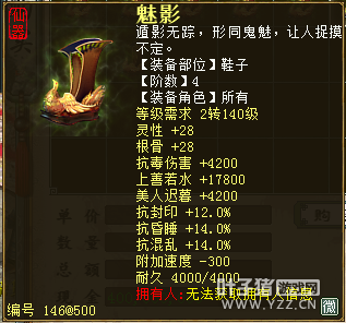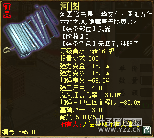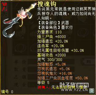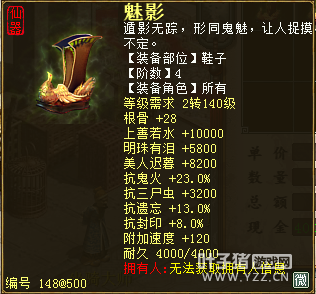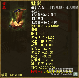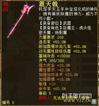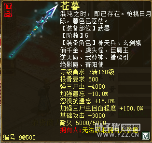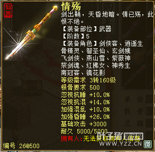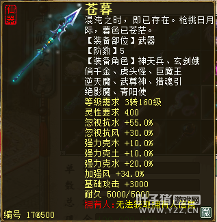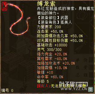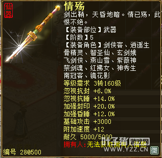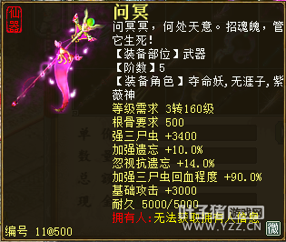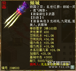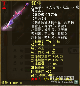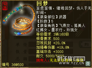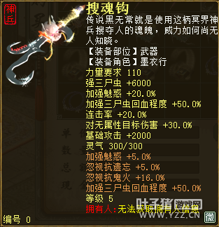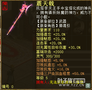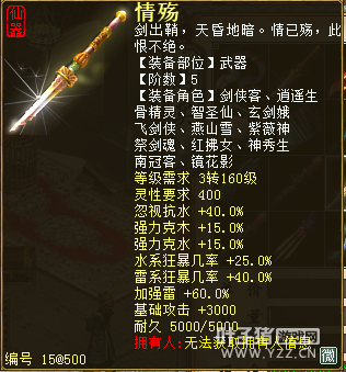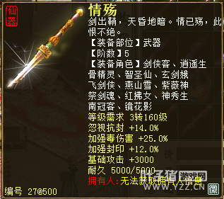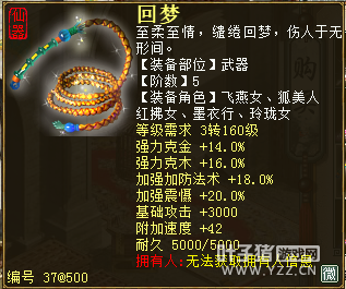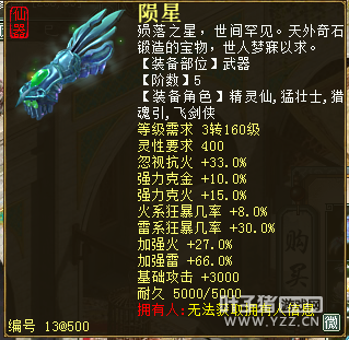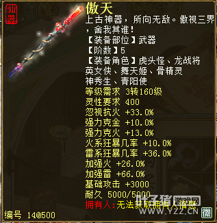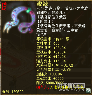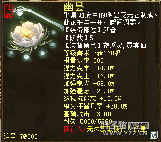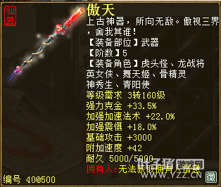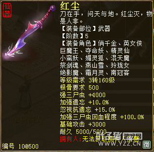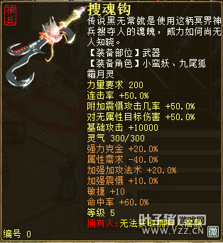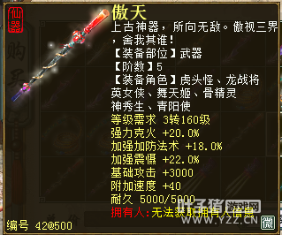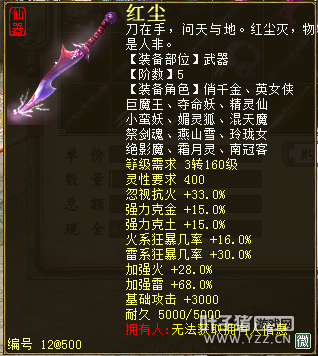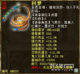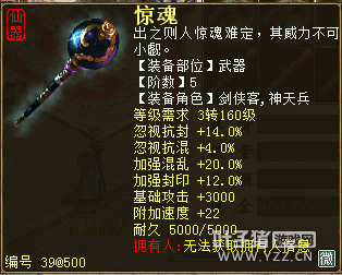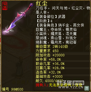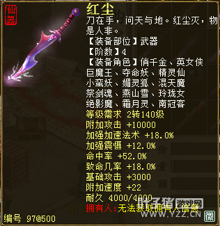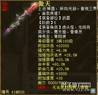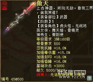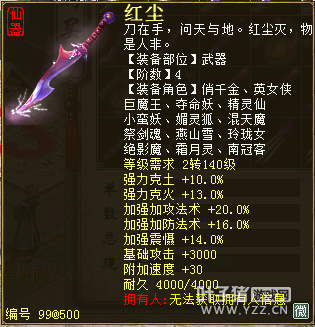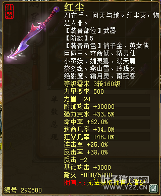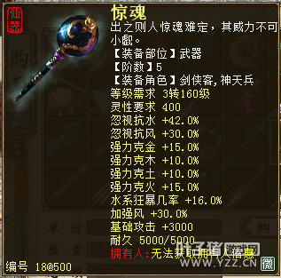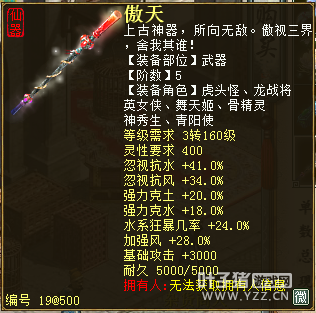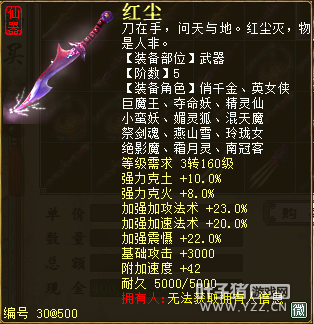 无差别服务器已开通,已经报名的玩家可以到登录界面的“英雄会”服务器登录,第一次需要创建一个角色,进入游戏界面后系统会提示10秒后踢出你的角色,重新登录你的角色就是170级了。 >>>推荐阅读:五阶神兽快来体验 大话西游2无差别赛账号配置出炉 本次,要给大家介绍一下无差别服务器的装备,做了一个装备大全,大家看看系统为我们准备好了那些装备呢? 【仙器篇】 大家首选自然会是仙器,系统分配的仙器为4阶和5阶,只有武器和鞋子两类,其实武器有4阶和5阶,鞋子只有4阶,下面我们看看这些配置的属性。 ①5阶武器(70把) 女鬼5阶武器