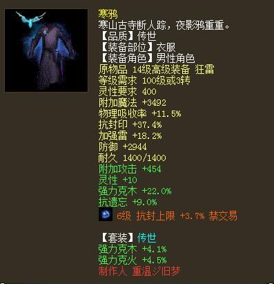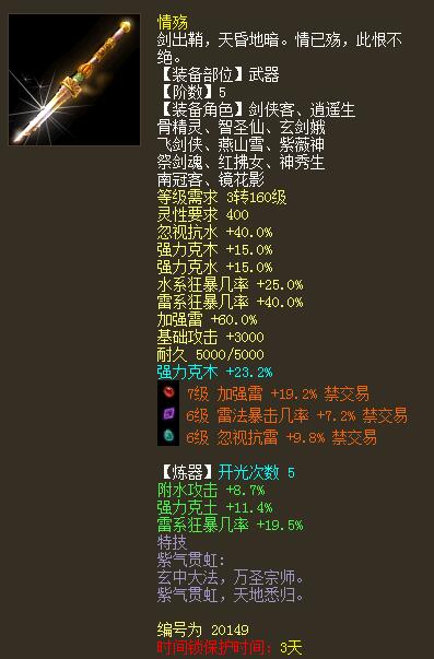 最标准的五阶仙族是什么样?其实并不会出现全套仙器的情况,大多是一把五阶武器,再精心搭配一些高级装备,达到此类仙族的火力最优化。 下面这位小仙展示了自己的一身雷法克木装备,围绕五阶仙器为主,算是小精品了: |