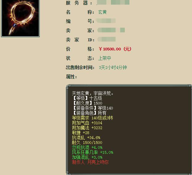 近日一条标价3.6万的十五级项链上了阁子,在上架的一瞬间就被秒了! >>>推荐阅读:一周囧图:强法200暴力神仙 4000敏魔初现 这么贵的价格,到底是什么样的属性?来看看这条链子: 看完之后,很多围观群众觉得这还卖便宜了!毕竟当初的这一条类似的链子,可是被开价10万呢: 但再看了看阁子,同样出现忽视4强混3的,只是少了蓝字的链子,却连1万的售价都卖不掉: 看来,土豪们买东西真是只要极品,钱不在乎滴~但属性差一点都不行咯! <<<点击进入大话西游2论坛讨论>>> [编辑:韦小贝]