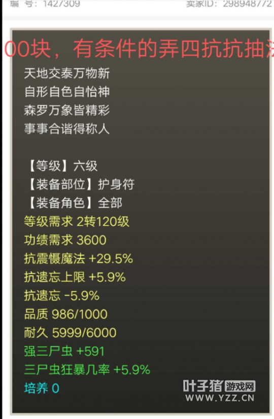 不到2000打造堪比双回男鬼,有兴趣的小伙伴可以试试。最后属性,三尸数字8000左右,回血程度120左右,三尸狂暴几率65左右,抗物理105左右,躲闪率115左右。其他配饰自己搭配抗性,套装建议六芒加破军。 |