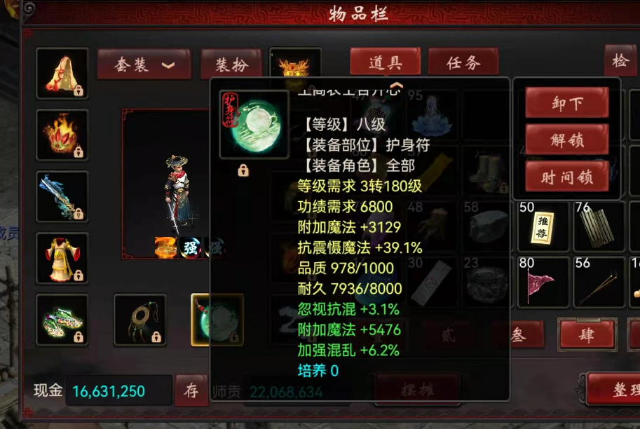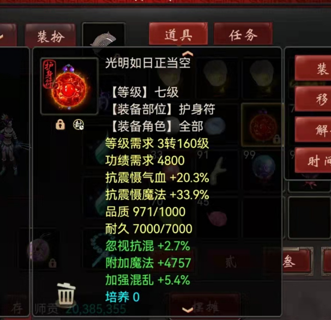 想要一个抗震慑气血和抗震慑魔法的双混护身符,关注阁子两年了,没见过人家卖,都放弃了,装备都调了抗,结果昨天小号洗出来…… 第一个是1400买的原始属性,洗上面双抽969以上品质双抗抽,花了7.2E没洗出来,区里垃圾护身符都被我干涨价了…… 第二个是买的底子,自己洗出了双混属性! [编辑:宁财神]
