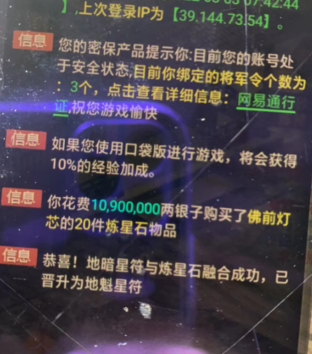 玩家分享自己的升级星符神奇经历——上线之后,看到自己还有2个炼星石,于是购买了18个,直接一发入魂,升级到13级了,第一天就这样结束...但第二天上线后,他还想重复昨天的神奇经历,不知能成功么? [编辑:宁财神]