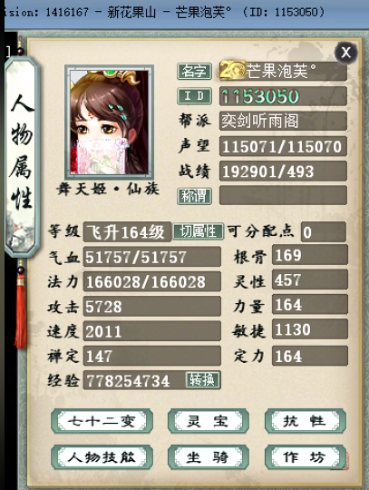 玩家说,新花果山开服第五个月,自己的号终于玩的有点起色,今天忍不住前来展示啦~ 她想证明自己曾经来过这个区,并且一直喜欢仙族,而且是喜欢火法女仙,自己开心就好,游戏本来就是给自己提供快乐的,一起来看看她玩的如何吧! 练功狂人排行第一