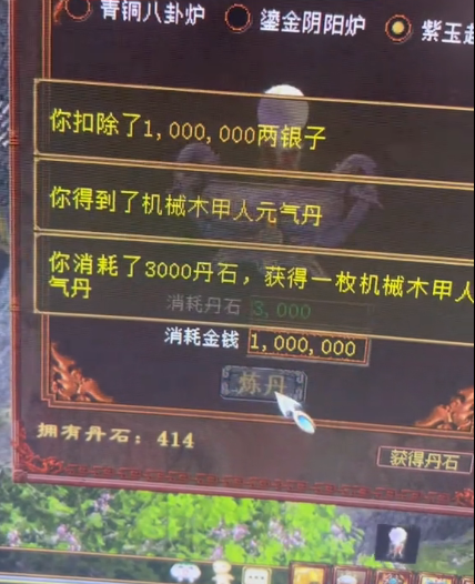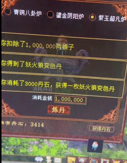 大话西游2元气丹提炼进行中!今天这位玩家,要挑战3000丹石一次的紫玉超凡炉,据说这个炉子真的能出超级丹哦! [编辑:宁财神]
