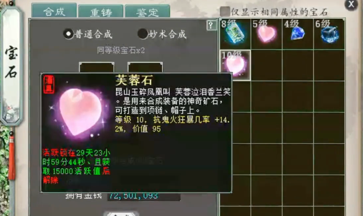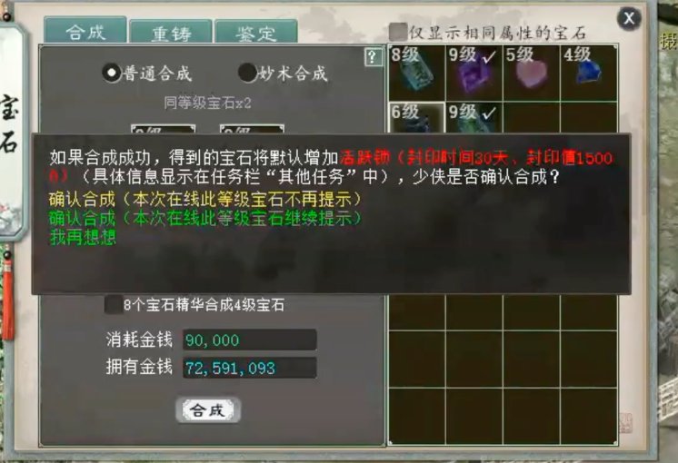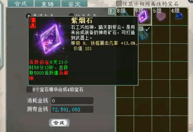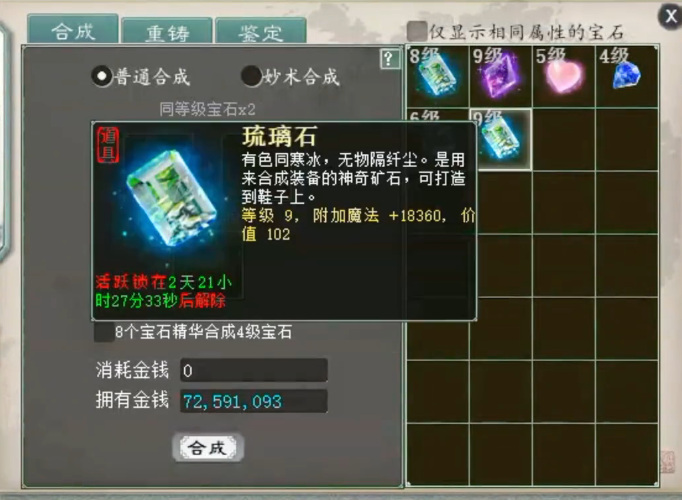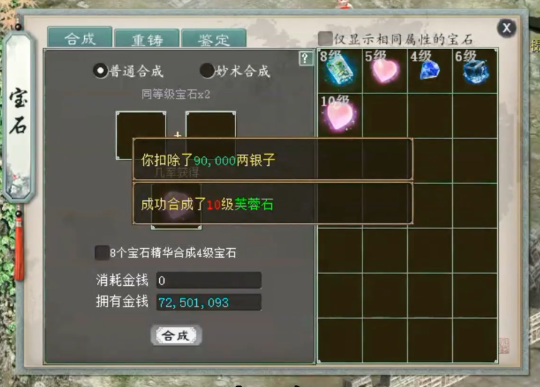 大话西游2宝石的成交价,除了有等级区分外,其合出来的价值也非常重要,例如10级120的奇异石能卖到百万之多,而10级105价值的宝石只要六万多,95价值的更是只能买到一万多,今天这位玩家就挑战两块9级宝石合成10级,看看他能赚多少? [编辑:宁财神]