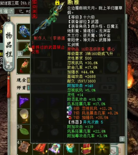 风暴39的超级武器,放眼整个江湖都算少见吧?而他不仅拥有这把顶级武器,同时还拥有一条非常帅的风克项链,咱们先来欣赏下他的总体属性,再来看两件装备的全貌! 超极品属性展示,克火340,会是抗风67.5,强风105.8,风暴84.1,程度40.6