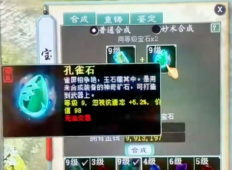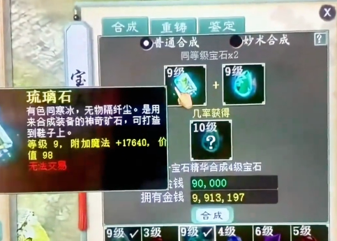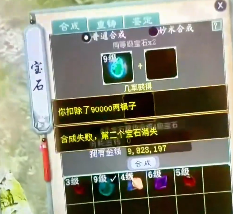 今天这波合成大话西游2宝石很不简单,因为是两颗9级师门宝石!这是多少年的努力,才能合出9级宝石啊,这位兄弟真是胆大,9级还不满足,还要继续挑战冲10! 9级宝石合成10级