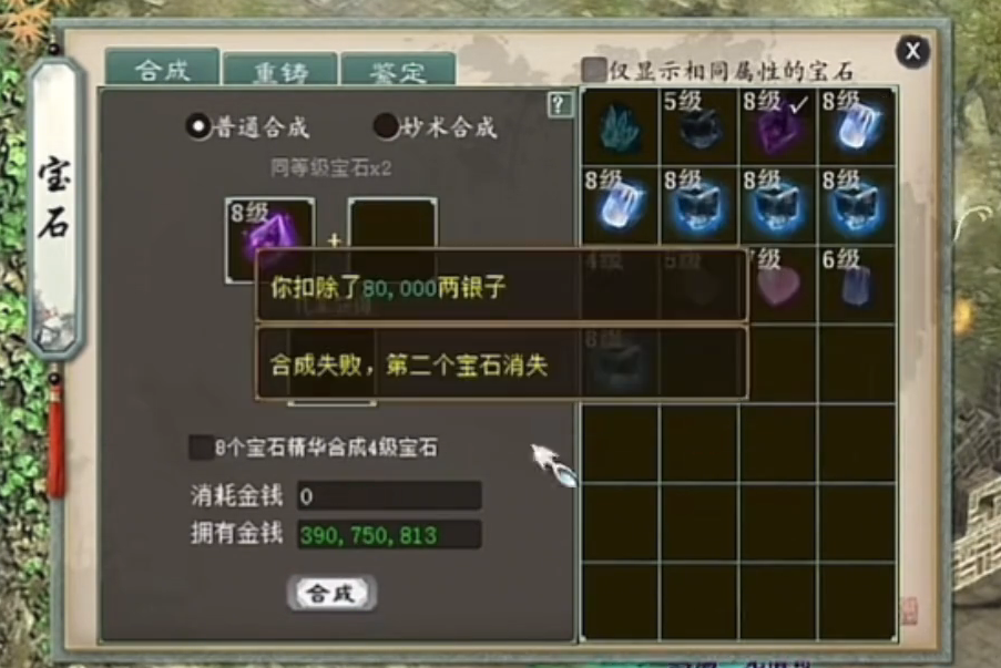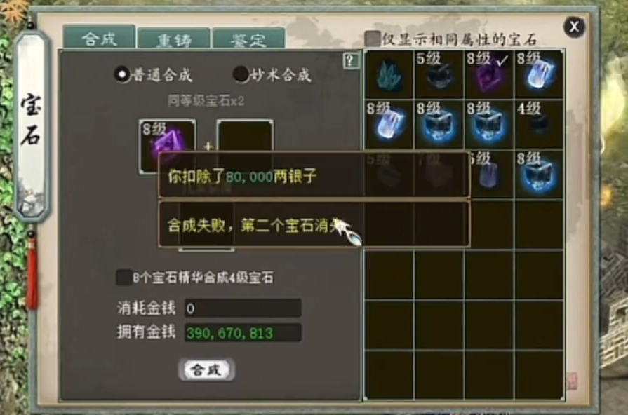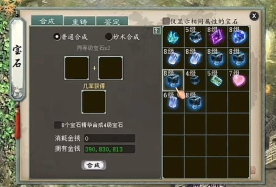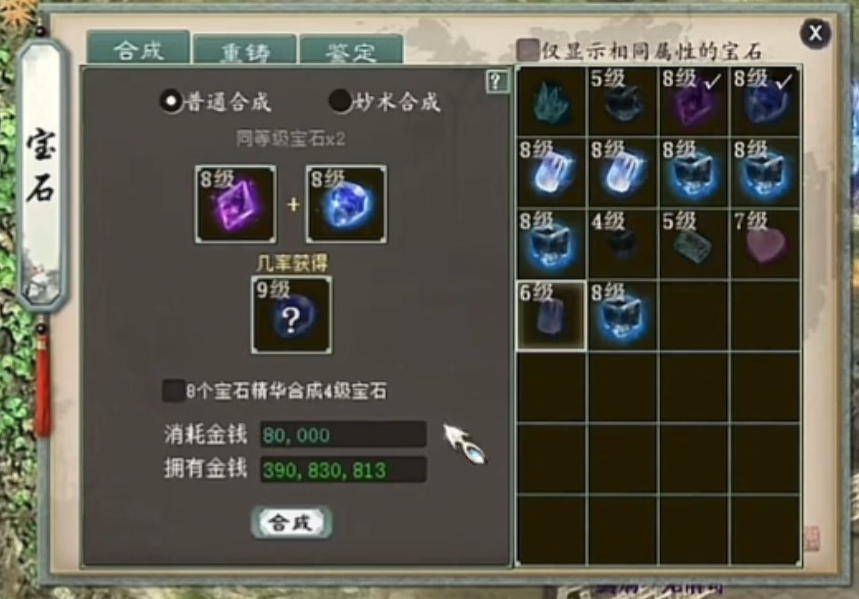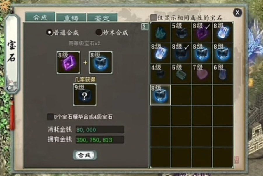 整整八颗八级宝石,这位兄弟准备来一波合成,看看能出几块大话西游2九级宝石,由于现在每天只能合成9次,希望在有限次数中,成功率能高一些! |