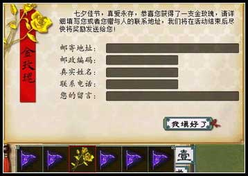 每个服务器都有一名超级幸运的玩家获得织女送出的金玫瑰,当得到金玫瑰时,赶快与自己心爱的人一起分享吧,点击使用,写下自己的地址,会有“喜鹊”帮您送到指定的地址,见证不渝的爱情#98 |