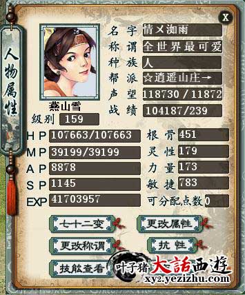 大家好,我是京华烟云的小雨——情ㄨ洳雨,我的快乐宣言:做最快乐的女人,也做大话里最快乐的女人! 这号断断续续玩了四年了,我是三世速法满男魔转的女人,刚三转的时候我是全敏女人,当大话2推出500根骨强人法装备的时候我就跟朋友说我想弄个500根骨,理论上是可行的,后来叶子猪上展示了500根骨男人,验证了实践的可行性,我就着手洗点,洗心革面,重新做人,因为前几世只有速法满了,所以血法没有那么多,但是伴随着新装备的出现,我也尽量弄好装备来弥补这些缺陷,虽然没有OS,没有神兽剑,但是我还要这样做,做自己想做的才最快乐。 平民玩家我定义:所谓平民玩家,不依靠大量的RMB帮助,靠自己在游戏里努力打拼得来,一样很快乐的玩家,所以以前有人说,平民没有仙器,没有神兽,才叫平民,我认为这是错误的,如果哪天任务你得个神兽,你就是RMB玩家了? 等级还需努力