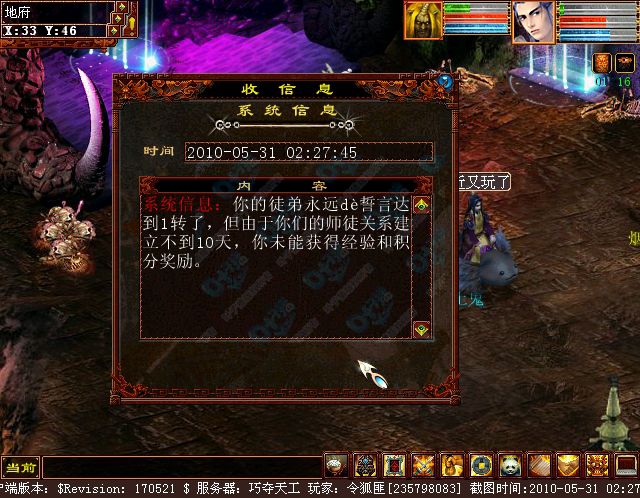 前几天收了个徒弟,练级超猛,法也都烧了,先前带着刷天杀10称杀星到了102转生。2点20多找孟婆转了,结果系统发来提示…… |