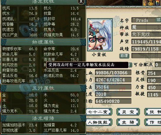 推荐阅读:大话2老话重提:商人影响游戏经济吗? 无仙器,无神兵,直接上图,还有各位朋友别说和敏队打,咱不提遭遇,我还有500根骨属性,只谈打4 阶5阶常规队、抗鬼火、抗水、还是抗别的都可以调。 踢馆前天主页上,6000元打造的那个魔。 <<<点击进入大话西游2论坛讨论>>>
