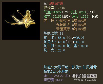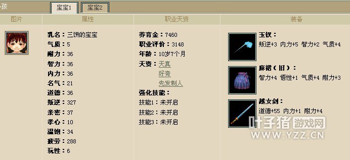 服务器是1-4年区,壮志凌云,11年8月开的区,到现在两年了。 >>推荐阅读:坚持不懈!高宝图挖宝终获破物理金箍棒 角色是男鬼,女魔修正,因为是后来才练的号,所以级别比较低,3转177,所以导致天赋还没有点,只有18点,本来是准备飞升后再点天赋的。师门贡献攒了5000万了,神秘小票也已经两组了。孩子16岁3个月了,目前评价4719,18岁后绝对可以5000左右。坐骑6坐、2坐全满。 装备全是男鬼极品装备,强数字装(数字的配合双回比程度的好)和反震装各一套,都是好不容易收齐的,绝版抗浩然物理戒指一对,满默契配饰一套。武器是4级双回,鞋是3级人法补丁。 <<<点击进入大话西游2论坛讨论>>>