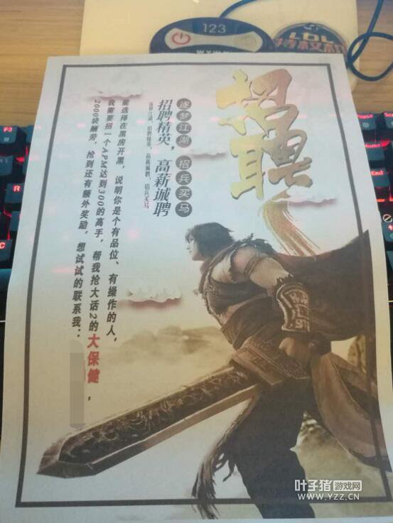 昨天周末,跟几个兄弟去网吧开黑,我们习惯性的去了一个“五黑包厢”,结果在包厢的桌子内测看到一张纸条,准确说是一张招人的“海报”,言辞犀利,还简单的手绘了些花边。 看了这张“海报让我虎躯一震,看来大家都知道真正的高手在民间啊!兄弟们,我发个帖子来求告诉,APM我达到了,你说这活儿咱能去干吗?