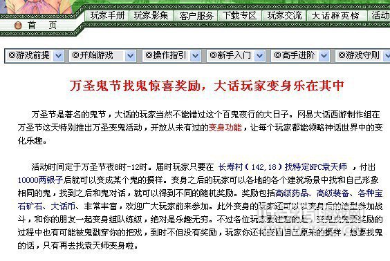 不知不觉大话已经陪伴我们走过了16个年头,在这些年里出现过非常多的任务,有经典玩家们喜欢的,也有部分玩家吐槽的,小编在这里记忆了几个最经典的大话任务呈现给大家,希望可以让大家有美好的回忆,欢迎补充。 2002年伊始,万圣节找鬼,玩家变身乐在其中 |