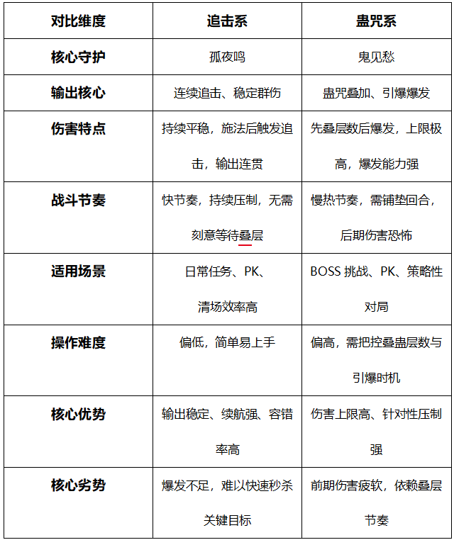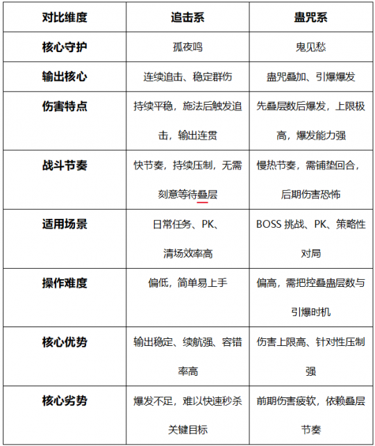 五、追击系和蛊咒系的玩法建议 追击系以通灵守护【孤夜鸣】为核心,主打连续追击、稳定群伤,伤害平稳、节奏快,不需要复杂铺垫,上手简单、容错率高,无论是日常修罗、风情、副本,还是休闲PK,都能稳定发挥,是兼顾效率与省心的万金油选择。 蛊咒系依靠通灵守护【鬼见愁】叠加蛊咒层数、走蓄力爆发路线,该流派节奏偏慢,但爆发上限极高,需要把控叠蛊咒与引爆时机,操作与装备要求相对也高一些,适合喜欢战术博弈、追求极限爆发的玩家。 六、总结 综上所述,追击系和蛊咒系各有千秋,没有绝对的强弱之分,只有风格上的差异。玩家在选择时,应根据自己的玩法和喜好进行抉择。若你钟情于畅快淋漓的持续输出,追求高效稳定的战斗节奏,那么追击系或许就是你的不二之选;若你享受运筹帷幄、掌控战局的成就感,乐于在战斗中精心布局、伺机爆发,那么蛊咒系定能满足你的期待。 只有找到最适合自己的流派,才能把把神巫的威力发挥到极致。与此同时,我也满怀期待神巫门派全服开放的那天!届时,大话江湖必将因这一全新门派的加入而更加精彩纷呈! [编辑:莫听雨]