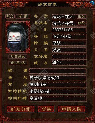 >>推荐阅读:极品豪华物资男人号:叫价15万寻人接手 2013年06月06日镜花水月 缘分天空服合并,新名叫昆仑天池。 新大话2来了,大家都在忙碌的升级,未来有幸采访到昆仑天池的潜龙在天,下面跟随未来一起了解他。 采访内容(潜龙在天以下简称潜龙,未来记者以下简称未来): 未来:您好,我是叶子猪记者未来,很高兴认识你! 潜龙:你好未来。 未来:先来个简单的自我介绍吧。 潜龙:我是来自昆仑天池的潜龙在天,男鬼。 未来:昆仑天池也应该是一个4年以上的服务器了吧,对于自己的服务器一定很熟悉,来说一下吧。 潜龙:是镜花水月和缘分天空合在一起的,可能是现在需要升级,所以玩家很多。 未来:确实呢,您玩大话多久了呢? 潜龙:02年出游戏就玩了,现在11年了吧……骨灰呢。 未来:哇。~又见老玩家,最近论坛要办一个关于怀旧的活动,还希望您到时候能来参加哦。现在队伍的现状是怎样的呢? 潜龙:有活动我肯定参加的……队伍还在发展,想在找个队友,目前我们4个人在一起,想在找个朋友一起娱乐发展呢…… 未来:队伍是一个怎样的队形呢?又缺少一个怎样的队员呢? 潜龙:现在队伍的多变加上针对,能找个有一定投资的玩家就行,因为我们女魔不愿意转型,所以在招收一个不是魔族就行,切属性使什么种族都能成为火力,或者控制。如果非要我选择,我希望来个人族吧。