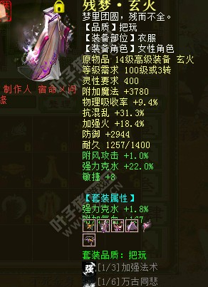 自我介绍一下,我是一位普通的大话玩家,断断续续也有好几年了。(毕竟离开过,回来过)同样这一次,也是一样。事情是这样的,我呢以前在琉璃仙境玩,后来因为工作上的事情,也加上一些朋友都换区了走了。就感觉没意思了,慢慢的自己也离开了。但是大话还是有它独特的魔力,我离开了3个月不到,就被一个和我同时离开的朋友提起,说要不我们回来玩吧,只是这样一提,我就动了心思。然后大家就都知道了,是的,我胡汉三又回来玩大话了。 >>推荐阅读:装备极品:来自滕王阁的大力男鬼前来指教 我记得应该是去年的10月中旬回来的,也就是13年的10月份。我先是看了个差不多的底子号,然后就开始打听装备愁装备。我这个人有点急性子,是的为了一件二件装备我甚至不远千里移民去买,所有的装备大概去了6个区吧。(这个时候可能一些朋友要说了,这不是平民做的事情,只是我觉得玩游戏最重要的还是图开心,何况移民的费用其实很简单就能省出来了,只是我比较懒一些。)经历了大概半个月左右吧,我的残梦装备差不多收好了,然后我就开始疯狂的魔王。没错,正是套装属性,期间我也发现作为一个灵活的克炮,或许我还需要一套敏属性,于是我又开始着手收敏装,良心话,敏装好难找,直到现在我也没有找到称心如意的衣服。同样也是疯狂的魔王,就在前段时间我的套装属性都毕业了。 但是因为个人的原因暂时要离开了大话一段时间,这两套装备是我历时半年左右收集齐的虽然不是什么特别好的东西但是都是自己的心血,希望寻找到有缘人。 <<<点击进入大话西游2论坛讨论>>>