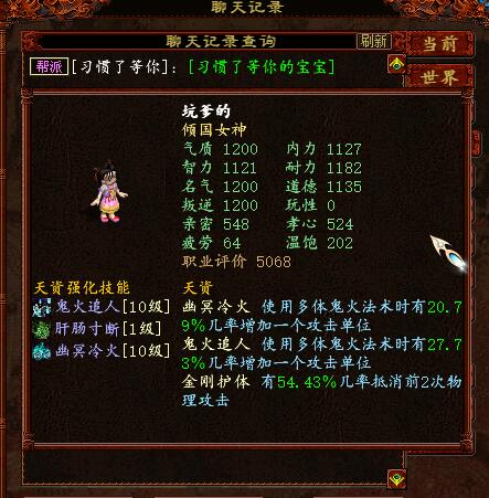 最近发现好多人在谈论鬼火鬼,我也写个吧。 首先我不克火;其次,我不是传世寒鸦,我连寒鸦都没,更别说传世寒鸦,我用的只是霄汉套; 再次,我玩的四年以下的区,老玩家知道,四年以下的区灵性鬼火装备很少,而且基本属于天价了! 和我谈论鬼火没仙法秒的多的可以不要看了,我自己有仙号,投资没鬼号投资多,可以说是连三分之一都不到,在某些日常任务中,伤害完爆鬼火! 打PK的也可以不要看了,我只是一个任务党,不喜欢去研究PK!装备投资(帽子270,衣服180,护身200,星符260买的12级的,两组炼星升的13级等于500+了,项链350买的,武器自己练的,先来看看属性和装备,最后附上几张伤害图: <<<点击进入大话西游2论坛讨论>>> [编辑:韦小贝]