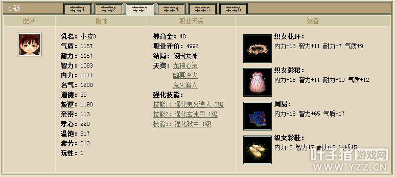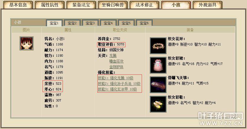 第一个孩子是老版孩子,亲密523孝心624,强化天资三个10级;这个孩子是他的混孩子,男人PK号必备的孩子,通常会使用的天资是:玄冰甲、金刚护体、孙子兵法;而因为飘渺郎君在去年团P的时候多数使用的是高敏混、超敏混,所以他的孩子有用龙腾,至于天资里的嗜血狂攻和金刚护体我想应该是后期换成男鬼上大力用的,天资强化没有更换。 亮点有二: 1、5078评价,配合装备,这个孩子是7项1200的。 2、将玄冰甲这个天资强化在第三个技能栏中,因为神结局的孩子第三个天资技能强化栏是可以强化所有天资;因为可出现的情况增多,从而导致在第三个技能栏强化天资变难;而玄冰甲这个天资在目前主流的PK阵型中,用的比较多,因为水法的好事成双,导致血队无论是女魔、男鬼、男人、仙(火力)都会需要玄冰甲。 而第一、第二个技能栏只能强化高级天资,相对就会比较容易。在更换种族、天资更换的过程中,天资的再次强化就会容易。 第三个孩子是个新孩子,新孩子的养法很常规,放弃道德,因为有1点玩性,所以评价看起来低了点,实际上评价是5012的。 这个孩子应该是后期飘渺郎君换成男鬼后才养育的,所以目前看到的是一个非成品,使用鬼族天资的状态。