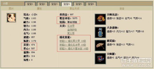 第四个孩子也是老版孩子,亲密孝心非常高,这个孩子是冰人的标配,玄冰甲、冥火甲、千里冰封。 其天资中有金刚,其实金刚的强化天资作用并不大,特别是高端队伍团P中,因为忽视物理程度是按百分比算的,只要对面忽视程度到了100,你抗多少物理都是枉然,所以天资强化中可以没有金刚护体的强化。 这里的金刚应该是后来转单挑后用的这个孩子。 冰人在PK中一般都是以中敏、中高敏、高敏的姿态出现,此时选择玄冰甲是为了防止对手火力比己方火力慢的情况下,触发玄冰甲后可以保证下回合的站立。 冥火甲的道理也是一样,冰人血量不高,高忽视鬼火下,霄汉鬼的伤害是非常可观的。 千里冰封不解释。 孩子