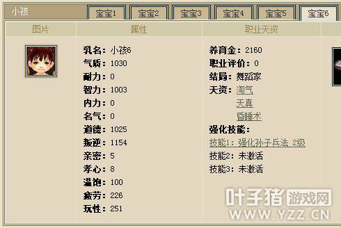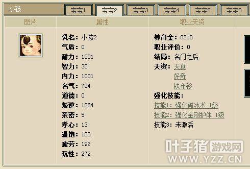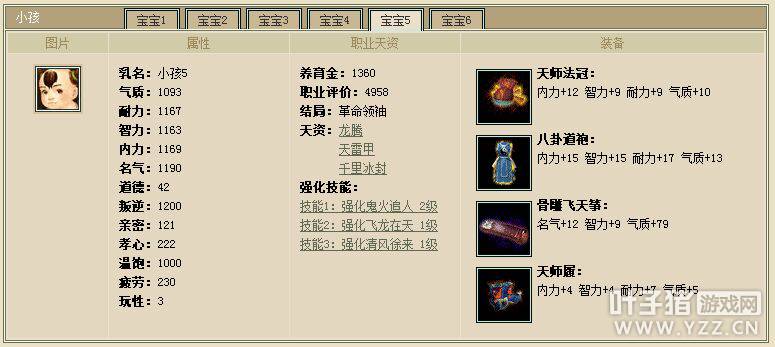 第五个孩子,这是个新孩子;看孩子的天资应该是准备打造成超敏冰的时候使用的,但是由于清号了,所以现在就是半成品。