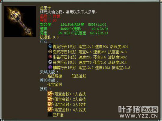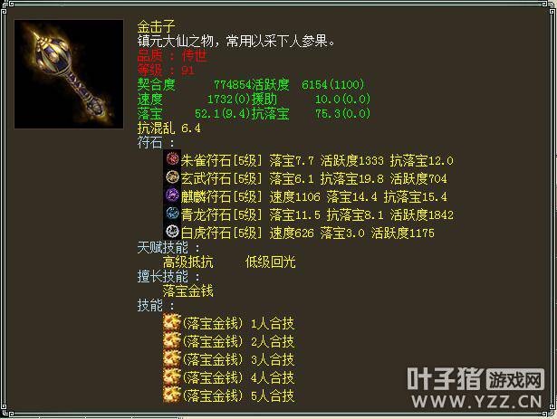 这个金击子的打造理念是求常在场,给予自己更多的机会去击落对方的灵宝;抗落宝75.3注定其在场时间不会短;落宝方面因为其原始爆9.4(最高10),所以其52.1的落宝是非常高的。 虽然这个灵宝里的5个符石都是新版,但除了速度活跃外,每块符石的落宝和抗落宝都是极品中的极品,先不论价格,能集齐都是一套就已经是非常不容易的事情。 这个灵宝的底子就已经是极品,藏宝阁曾有个灵宝原始不是低级回光,是低级敏捷的,1级金击子成交价8000+;即使有瑕疵,这个灵宝也不便宜。
