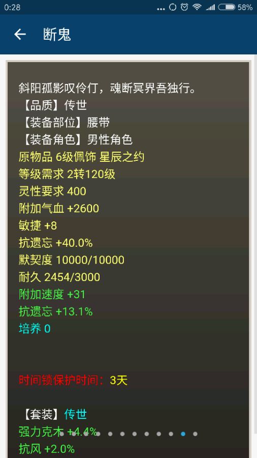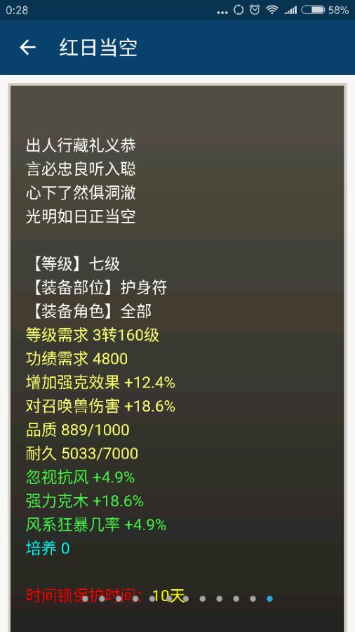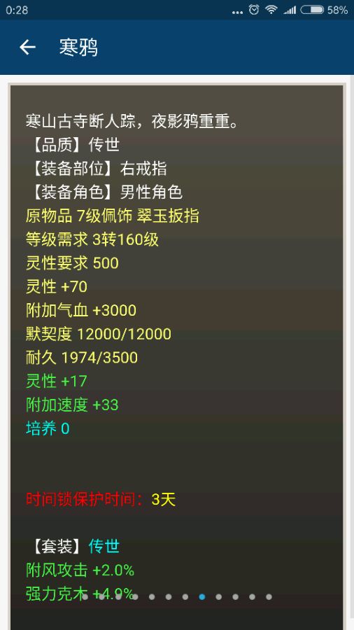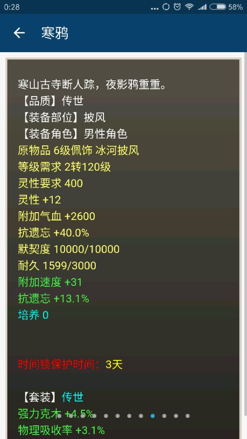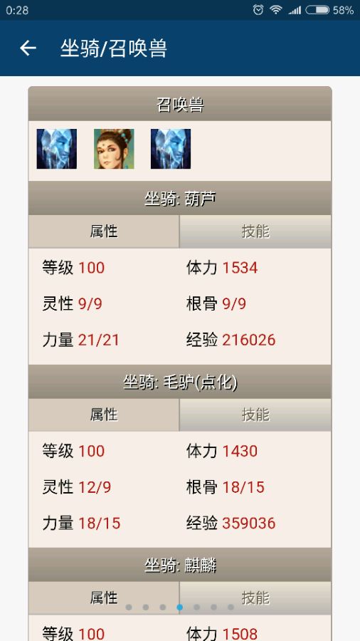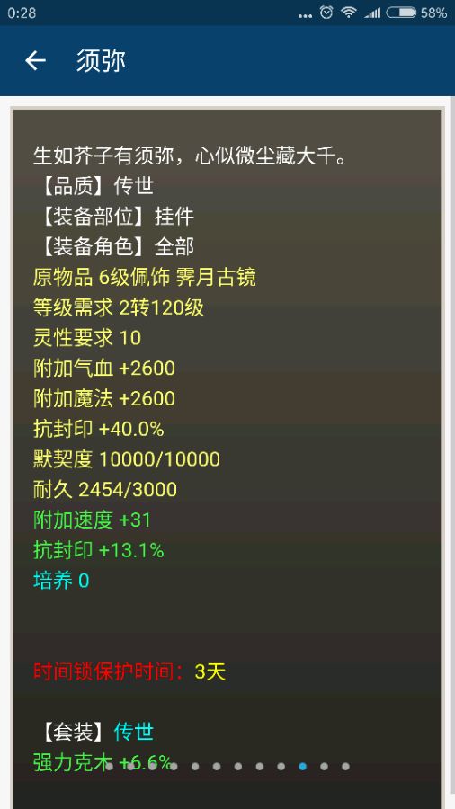 底子貌似不算给力,等级和天赋对于大炮来说还是很重要的 强法属性 强克属性,想必配饰洗得不错高忽视16级武器,宝石都是六级往上的 这个传世帽子的强法和克...不过属性非常给力,你们会喜欢这帽子吗? 传世衣服貌似也不够完美 敏灵很高,克6点锦上添花,7级宝石也非常宝贵 很不错的项链,高属性点+狂暴+克构成 以下是配饰一套,副属性都洗得不错 克木4.6 克木4.9 克木4.5 克木6.6 克木4.4 属性很不错的护身符,除了品质低点 三个宝宝没有具体展示,两头冰块估计一个是全敏首发另一个是隐身替补? 坐骑除了2座点化全满其他的都是未点化全满 一个极品孩子,四年以下很不错的存在