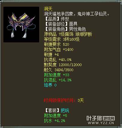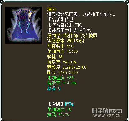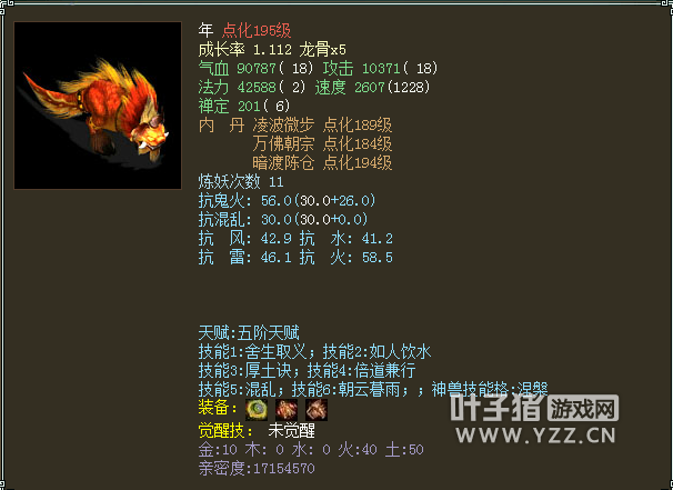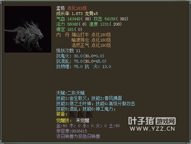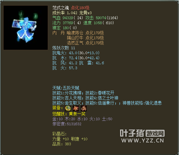 人物属性 以下是人物配置展示: 六阶斧头 六阶抗灵宝帽子 六阶抗灵宝衣服六级OS 六阶抗灵宝项链 双敏提抗护身符 基本所有的套装属性都有速度属性 传世洞天腰带 传世洞天面具 传世洞天挂件 传世戒指 传世戒指 14级双敏星卡,火猿星阵 身上携带两个超越4000敏的极品灵宝: 也有4046敏金击子还有4169敏神火罩,不过不抗落宝... 身上宝宝虽然不多,但都是精品: 首发年一头,土豪必备 春暖花开范式 接近1000W亲密的黑色孟极最后是极品孩子一个,5044评价,500+亲密600+孝心