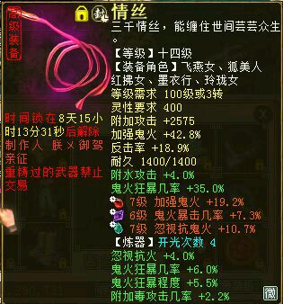 没有仙器,普通平民装备,这伤害是否足够优秀?接下来看看装备。 十四级灵性要求武器,鬼火狂暴很养眼 绿字三属性护身符,可惜品质略低鬼火狂暴克项链 双狂暴程度玄武星阵 战斗属性展示 5043评价的孩子,几乎成品 隐当克夜叉 克火果子 信土克火铁扇公主 41万血龙女 义金分花孟极 天梯等级