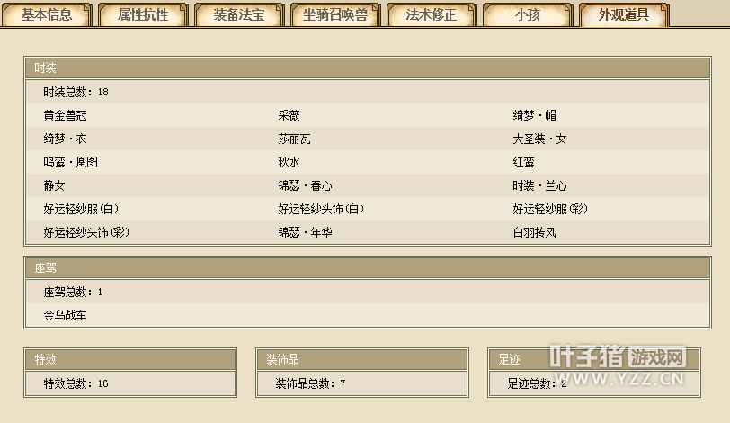 时装有18件,我发现礼服白紫都有,看来女孩子都比较喜欢打扮自己。特效16,装饰品7,足迹2,座驾也有个金乌战车,光这些也要银子几千块吧。原主人笑言以前还捐了一点,玩男鬼的时装也全捐了。好吧!你赢了!我们继续往下看。