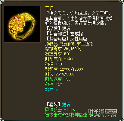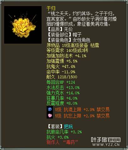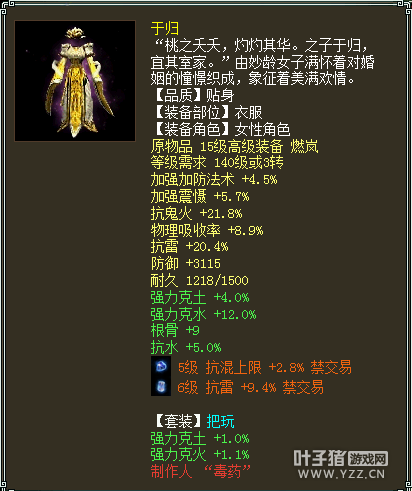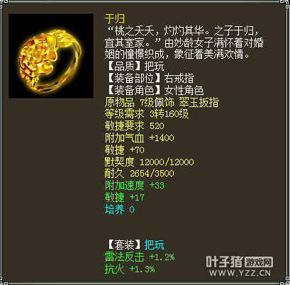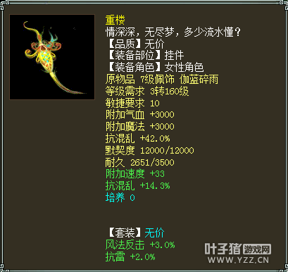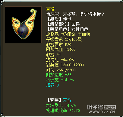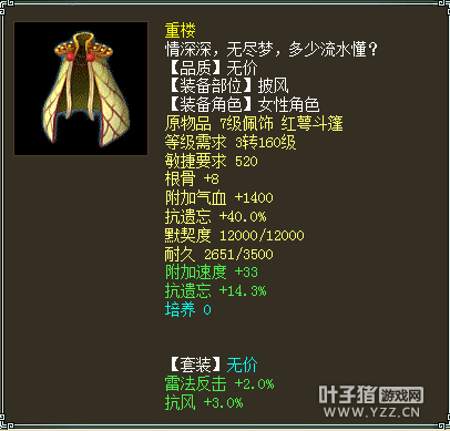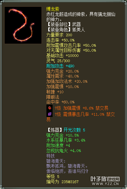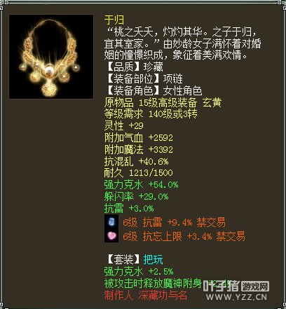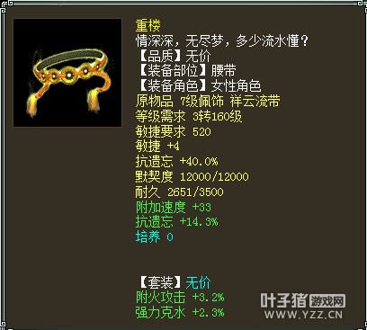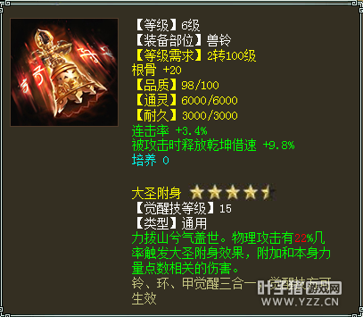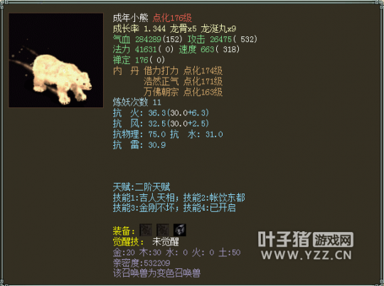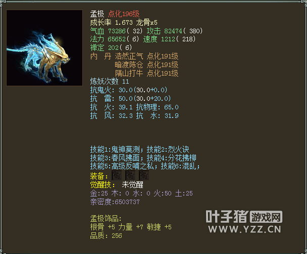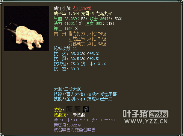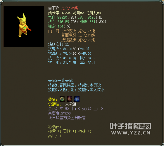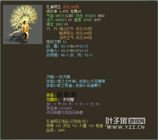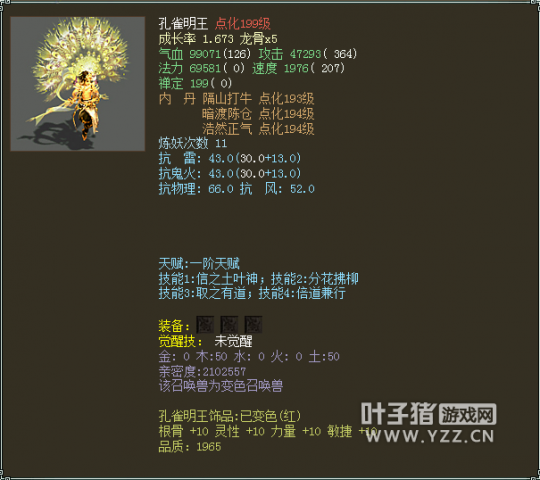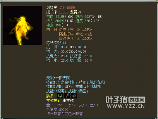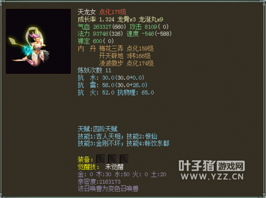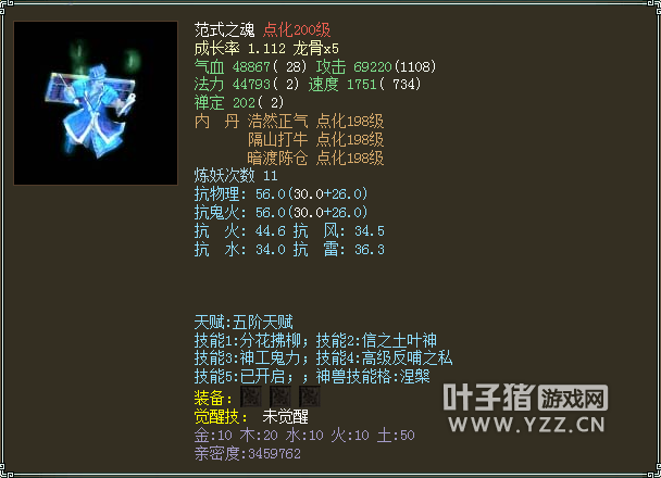 号开启了两套属性点,第一套是根骨魔属性,第二套是全敏属性,抗性方面没有抗封印,属性上应该是个神兵克水抽,我们接着看。 装备法宝一览