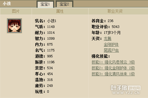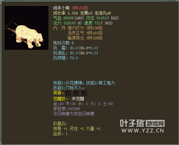 六个坐骑都是点化全满的,这对于强迫症玩家也是一大福音。七座都要来了,你的前六坐骑都已经满了吗? 坐骑全满还附送一头分花大熊 两套修正分别是男人和男魔的,从各种细节可以看得出来,这个虽然是男鬼号,但感觉像是为仙族(尤其是男仙)量身定做的。 两套修正和法门情况 这个宝宝虽然还没成年,但看这评价、亲密和孝心,在四年以下是相当极品的存在了。 孩子