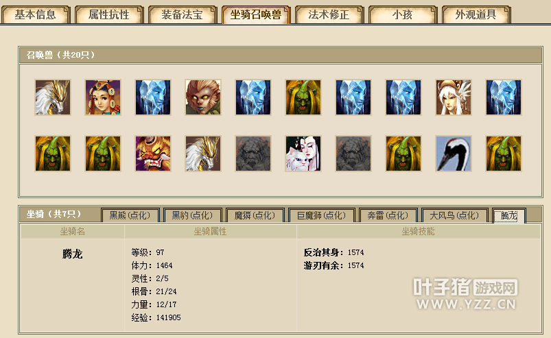 20个宝宝,6个坐骑点化,7坐骑还在练中