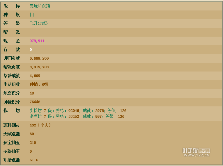 飞升176级的男仙号,功绩6116满天赋,7段帽子和武器作坊,基本信息合格。 属性抗性