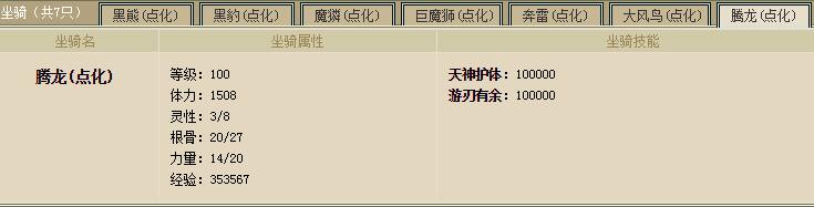 7只坐骑全部满级满熟练,其余的筋骨全部吃满咯!
